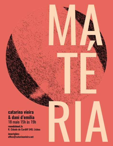 Matéria. Encontro. Partilha. Experimentação: A Matéria é um projeto artístico para me encontrar com os meus amigos artistas, com os meus pares, para saber o que andam a fazer, para poder conhecer mais sobre o seu trabalho e o modo como pensam, na prática, implicando o meu corpo nas suas questões e nas suas metodologias. Acredito que nos conhecemos, porque passamos tempo juntos, a fazer juntos, a resolver problemas, a comer, a fazer perguntas, a construir qualquer coisa. A Matéria instala dois ritmos, duas vozes, em cada encontro: o ritmo da minha própria pesquisa artística, que, quem participa na Matéria regularmente, pode acompanhar como se aprofunda, repete, ramifica, complexifica e o ritmo do encontro único, singular com a prática do meu convidado. Os convidados da Matéria são artistas com quem partilho algum tipo de intimidade, pessoal ou profissional, artistas que tocaram o meu corpo ou com quem estive em movimento alguma vez. Porque nos conhecemos há muitos anos, mas nunca trabalhámos juntos. Porque já trabalhámos juntos, mas o tempo curto de ensaios nunca permitiu que nos demorássemos em práticas indefinidas, de utilidade incerta. Porque dançámos juntos, mas nunca falámos sobre as estratégias que nos levam a pôr conceitos em movimento.